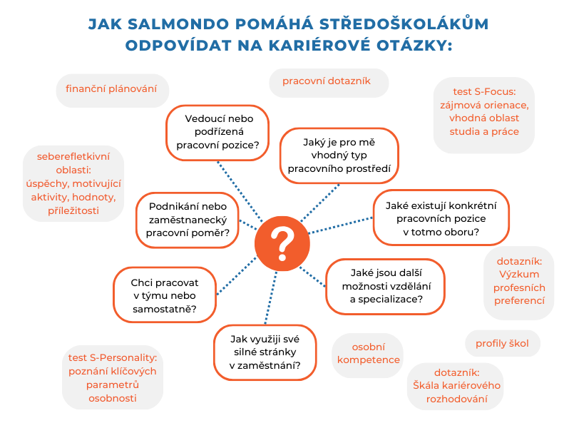 Žák může využít jen některé nebo také všechny tyto způsoby podpory. Salmondo není konkurencí poradců, psychologů či koučů. Právě naopak – jejich práci synergicky doplňuje.