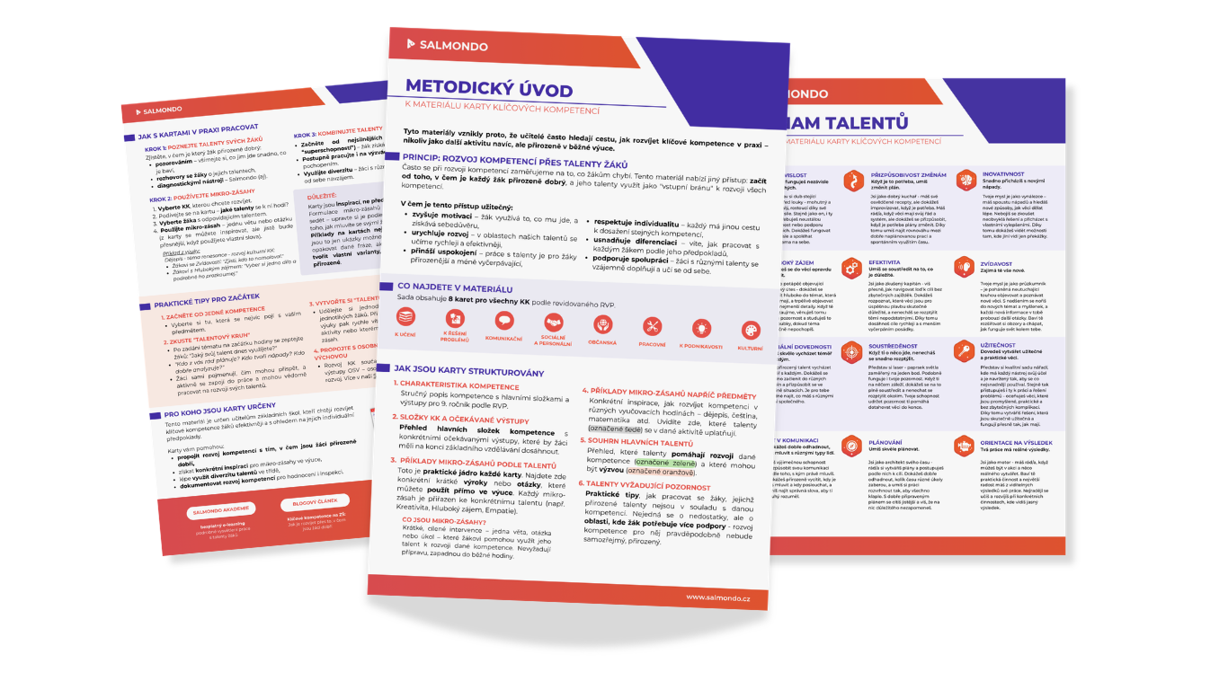 Protože se v aplikaci Salmondo dlouhodobě věnujeme identifikaci a rozvoji talentů každého žáka, bylo pro nás přirozené tyto dvě oblasti propojit. Vznikl tak metodický materiál, který talenty, se kterými žáci v aplikaci pracují, propojuje s klíčovými kompetencemi dle RVP.