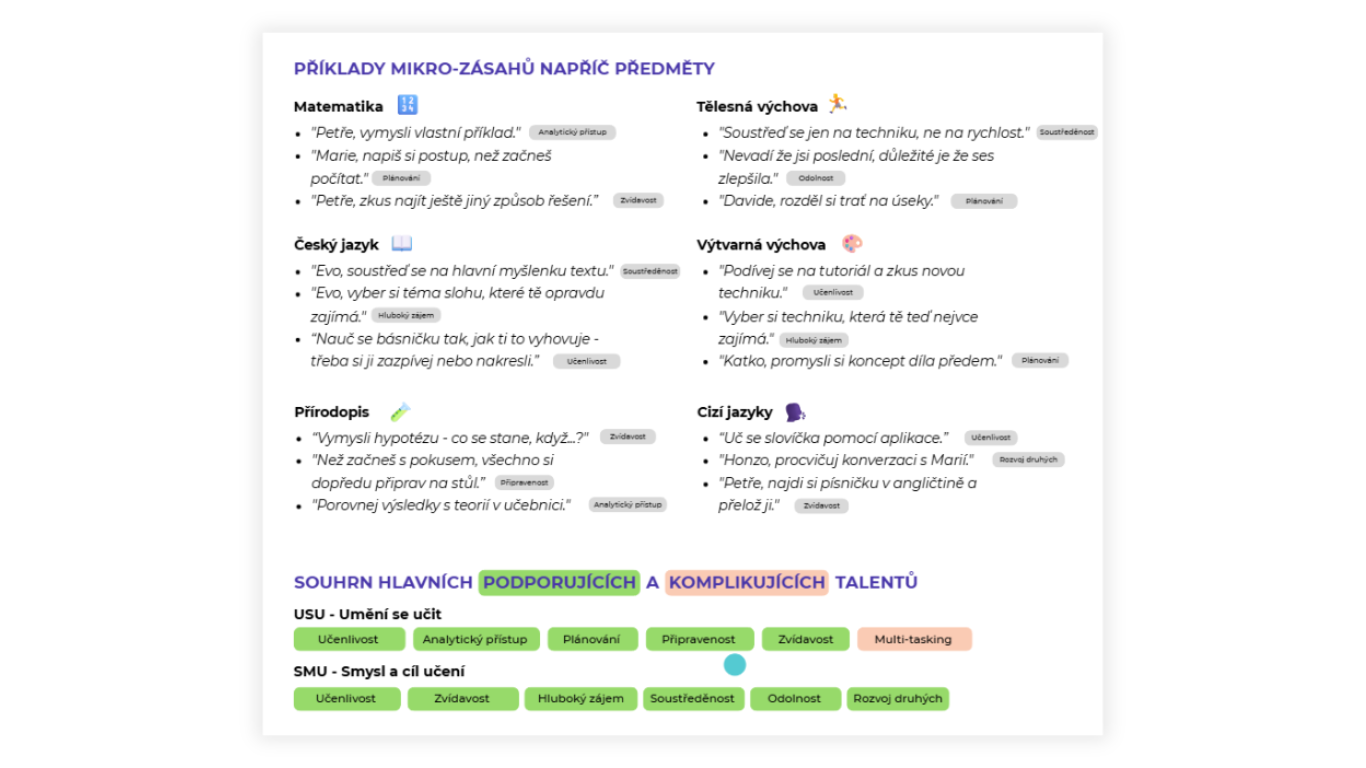 Každá karta obsahuje stručnou charakteristiku dané kompetence, její složky a očekávané výstupy pro 9. ročník. Praktickým jádrem jsou konkrétní příklady mikro-zásahů podle jednotlivých talentů a ukázky jejich využití napříč předměty – od matematiky přes dějepis a český jazyk až po informatiku.