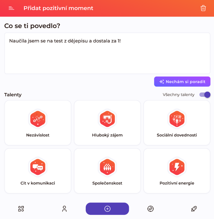 Velká novinka, na které jsme v posledních měsících v Salmondu pracovali, je konečně tady. Žáci si nyní mohou do aplikace průběžně zapisovat, co se jim daří, a propojovat tyto zkušenosti se svými talenty.
