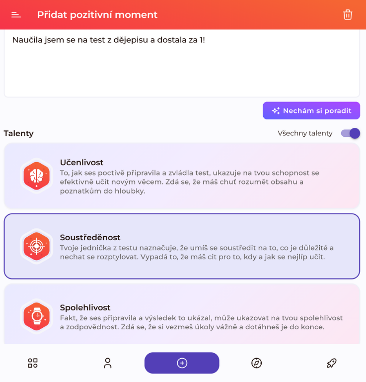 Informace o tom, které talenty žák reálně využívá, je mimořádně cenná. Díky tomu mu můžeme ukázat, ve kterých profesích dokáže své přirozené talenty nejlépe uplatnit. To je zásadní nejen pro profesní úspěch, ale také pro dlouhodobou spokojenost, vnitřní uspokojení a pocit naplnění.
